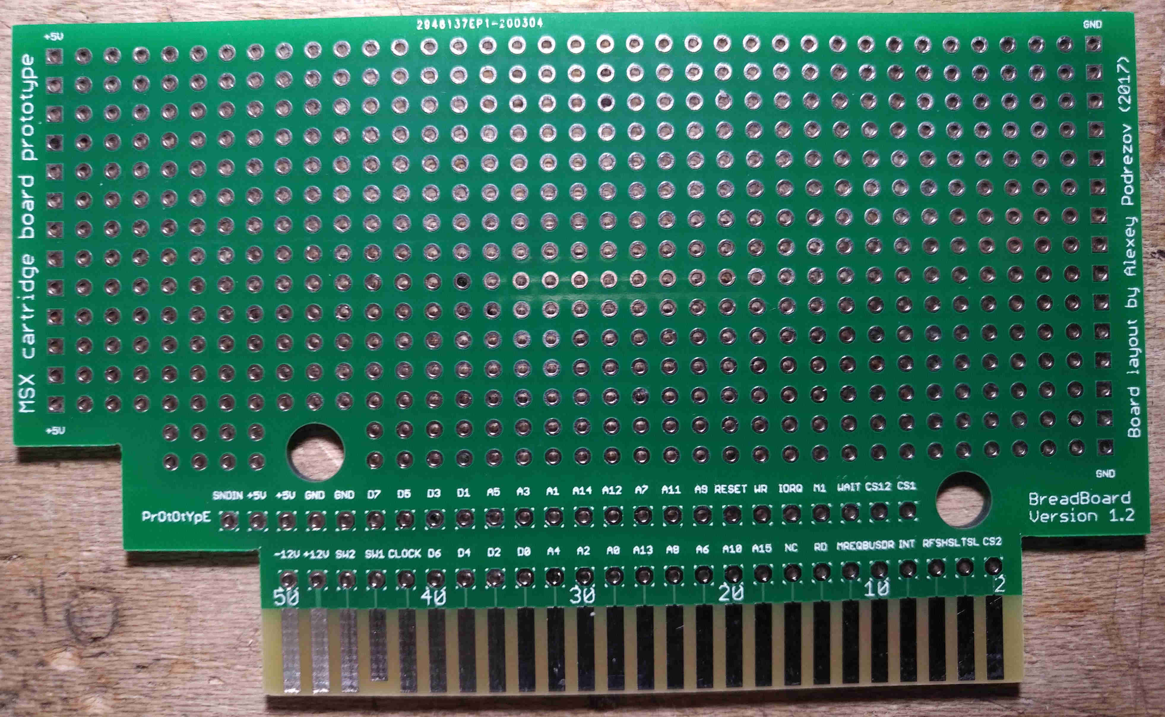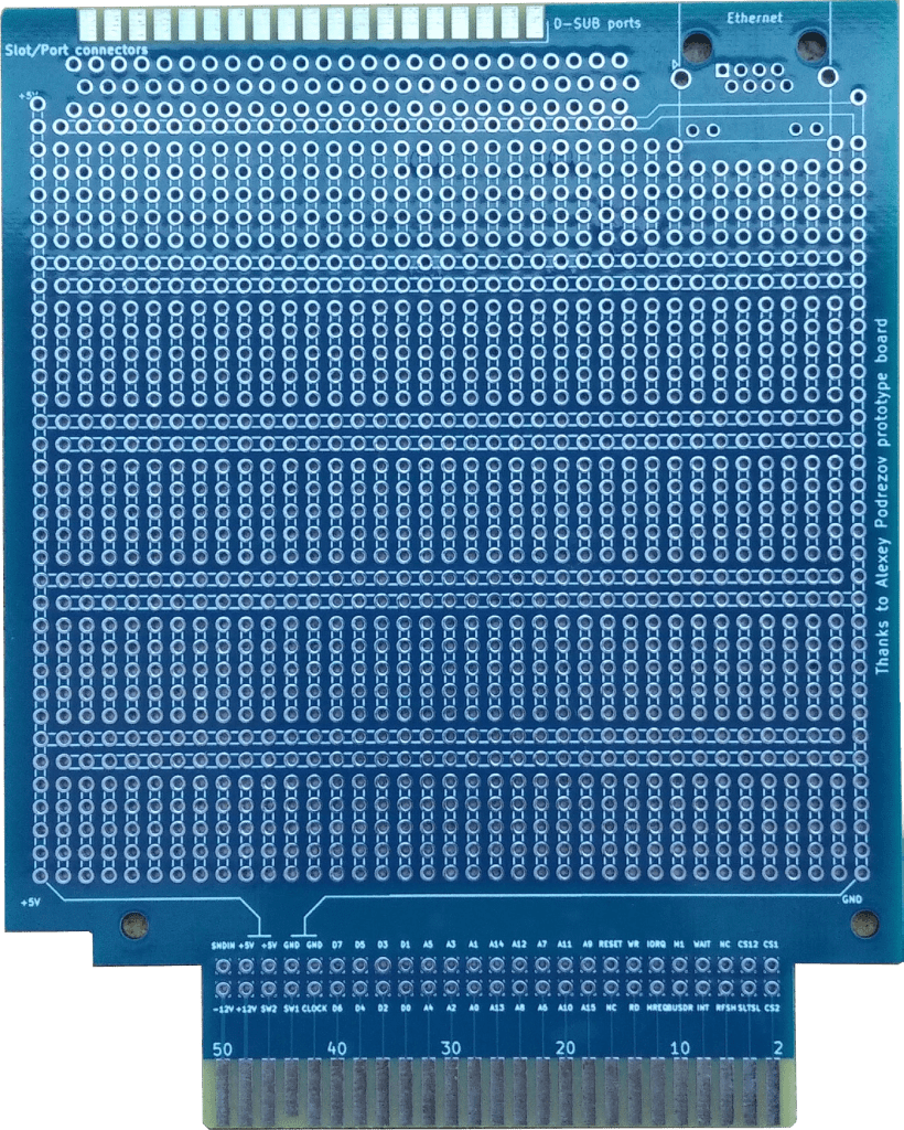 Para circuitos que requieran espacios más grandes o para separar más los componentes, también es posible utilizar el modelo grande de esta misma tarjeta MSX Cartridge Board Prototype (también de Alexey).