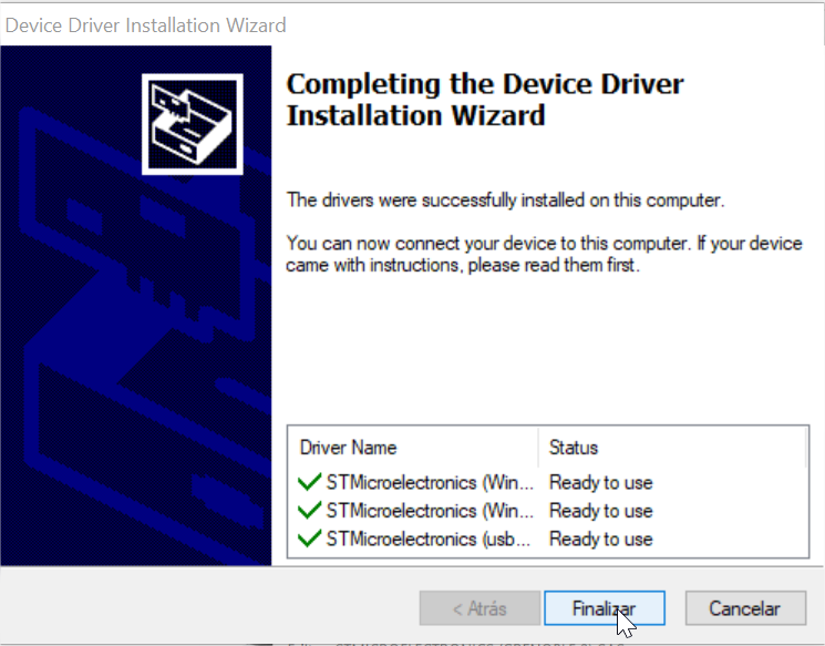 Una vez finalizada la instalación, retiraremos el programador ST-Link v2 del puerto USB y lo volveremos a insertar.