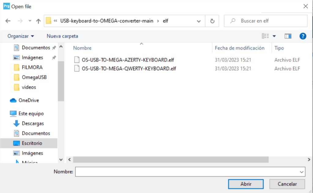 Aparecerá una pantalla similar a la imagen siguiente, con un circulo verde y la palabra «CONNECTED». Entonces pulsaremos sobre la pestaña OPEN FILE y buscaremos dentro de proyecto la carpeta ELF (USB-keyboard-to-OMEGA-converter-main\elf) y dentro el firmware que queramos cargar.