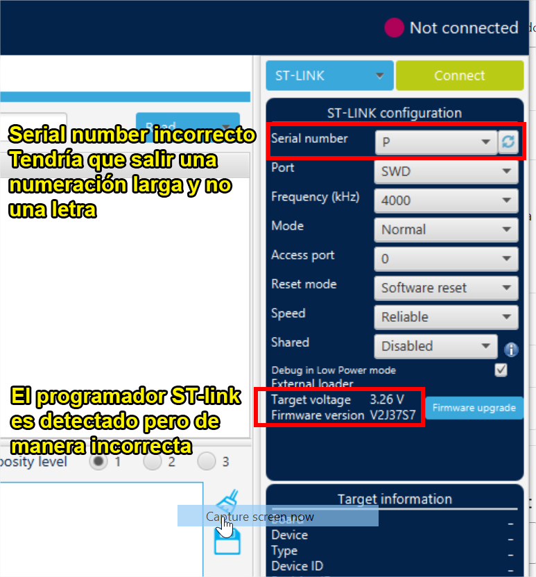 En este tutorial se ha empleado un clon chino del programador ST-link v2, y por tanto muestra el error que observáis en la imagen superior. Para resolver esta incidencia, hay que seguir los pasos siguientes: