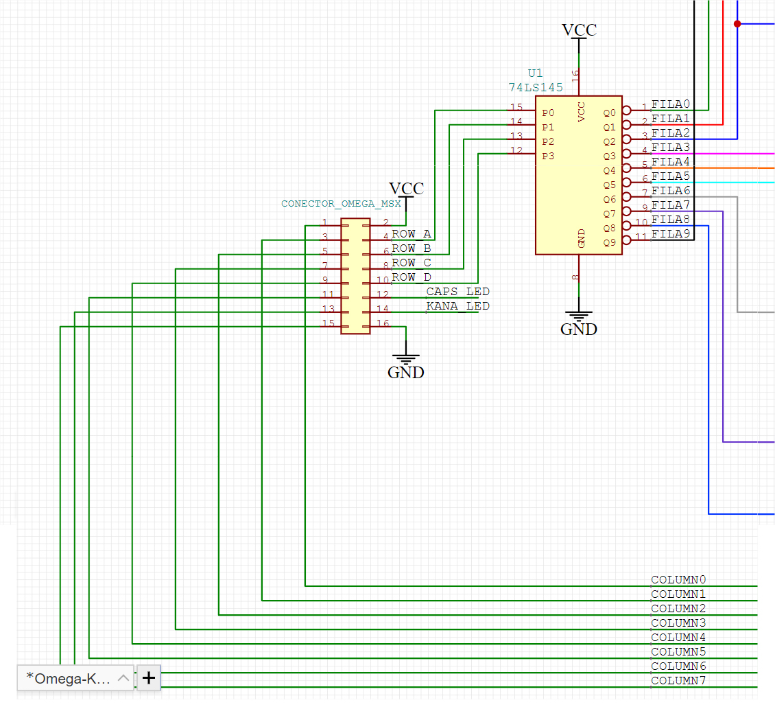 El circuito integrado 74LS145 es algo que lleva incorporado de serie la placa del teclado OMEGA, o a veces la placa base del ordenador MSX. Este es el esquema de como enlaza con el conector de teclado del OMEGA: