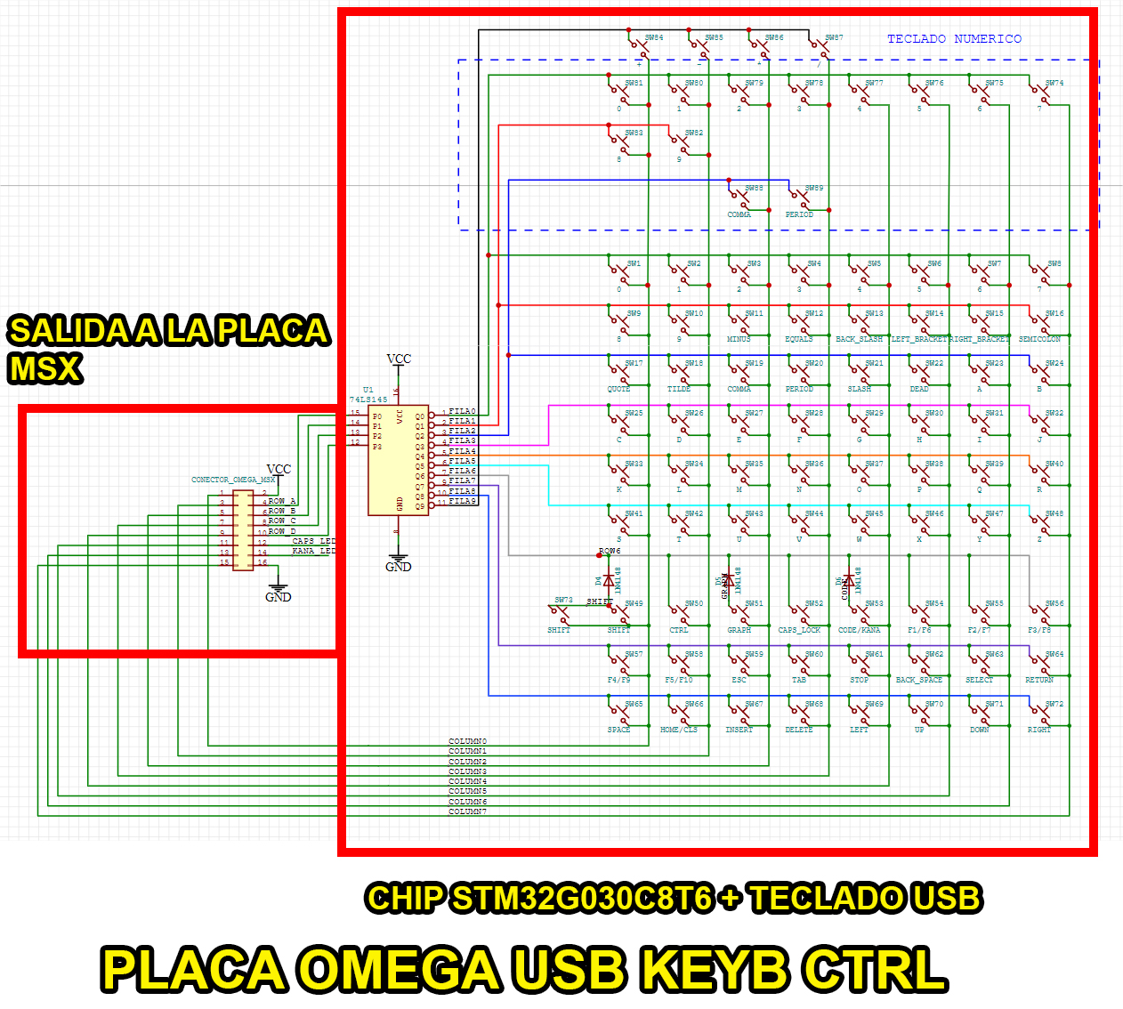 Las columnas 0 a 7 las tenemos en el propio conector de la placa OMEGA USB KEYB CTRL, pero las Filas (ROW) del 0 al 9 no las tenemos exactamente en el conector del PCB. En vez de ello tenemos ROWA (FILA_A), ROWB, (FILA_B), ROWC (FILA_C) y ROW_D (FILA_D) , tal y como se observa en la imagen de arriba