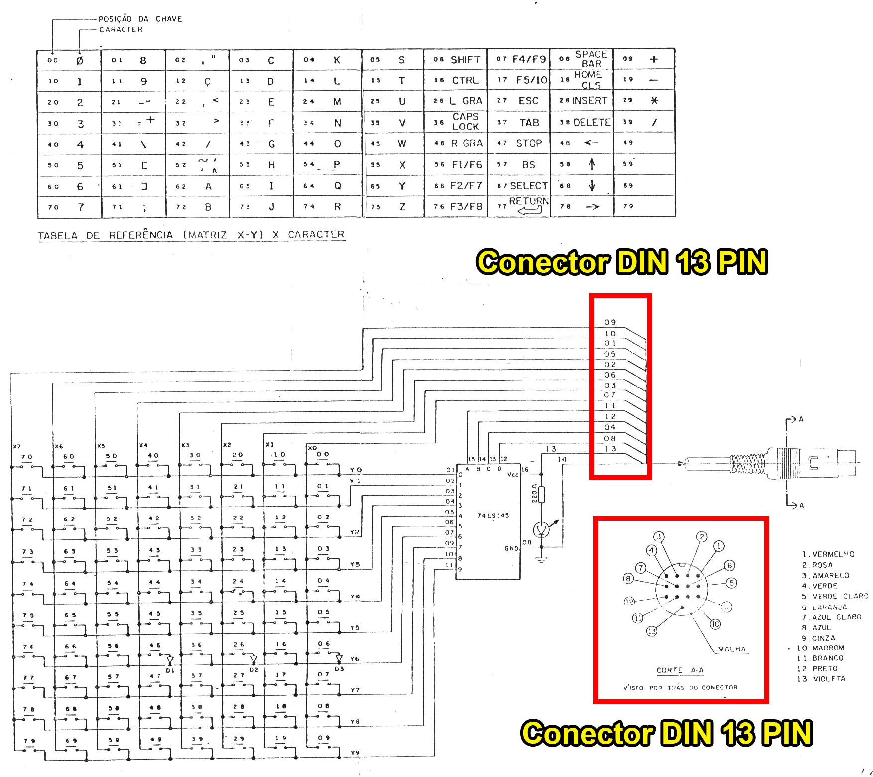 Como podemos ver, tenemos la MATRIZ del teclado con sus FILAS (RAW) y sus COLUMNAS, el chip 74LS145 y el conector que va la placa del MSX que en este caso es de 13 pines + GND (No es un pin propiamente dicho, si no la circunferencia metálica del conector DIN por lo tanto son 14 pines).