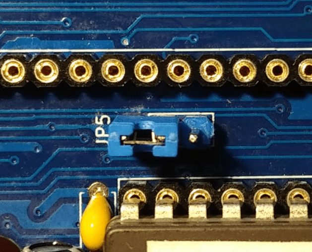 En el caso de JP5 si aconsejo poner pines de jumper para poder probar al menos 2 versiones de firmware. Como el de la foto: