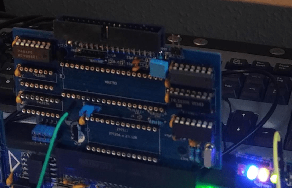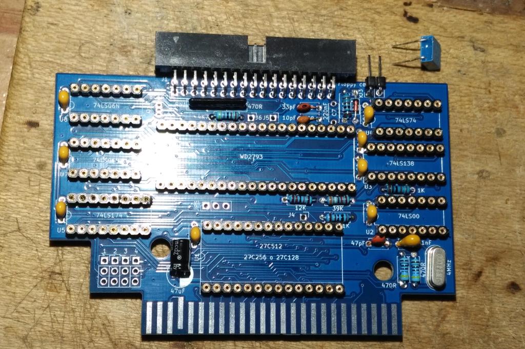 A continuación vamos a probar el sistema de control de disquetera. Tenemos que insertar U7 y U5 y utilizar la sonda en el pin 10 del conector de disquetera. Así está la placa: