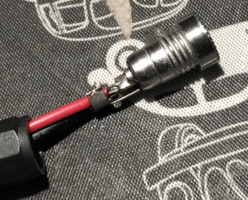 El cable rojo en el pin central y el negro en la paleta externa del conector (pantalla), cerramos el metal que sujeta los cables (sin que haga contacto con el positivo) y enroscamos la funda de plástico. Para mayor seguridad podemos enchufar la fuente a corriente, enchufar el adaptador sin la disquetera y medir si hay 5v entre los pines del conector de la disquetera.