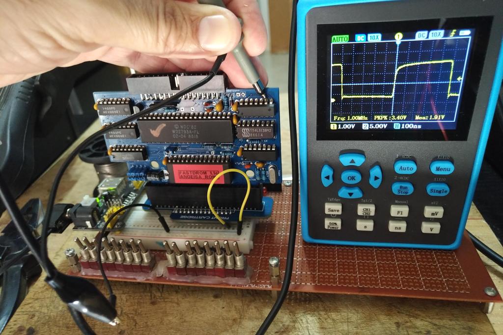 Si las frecuencias estan bien, podemos comprobar si el circuito de selección de puerto funciona como es debido, para ello, insertamos U8 y U3 (siempre apagando) y miramos la señal en el pin 4 del zócalo U6, en este caso he utilizado una sonda lógica pero se puede hacer con un polímetro midiendo tensiones (o con el osciloscopio mucho mejor).