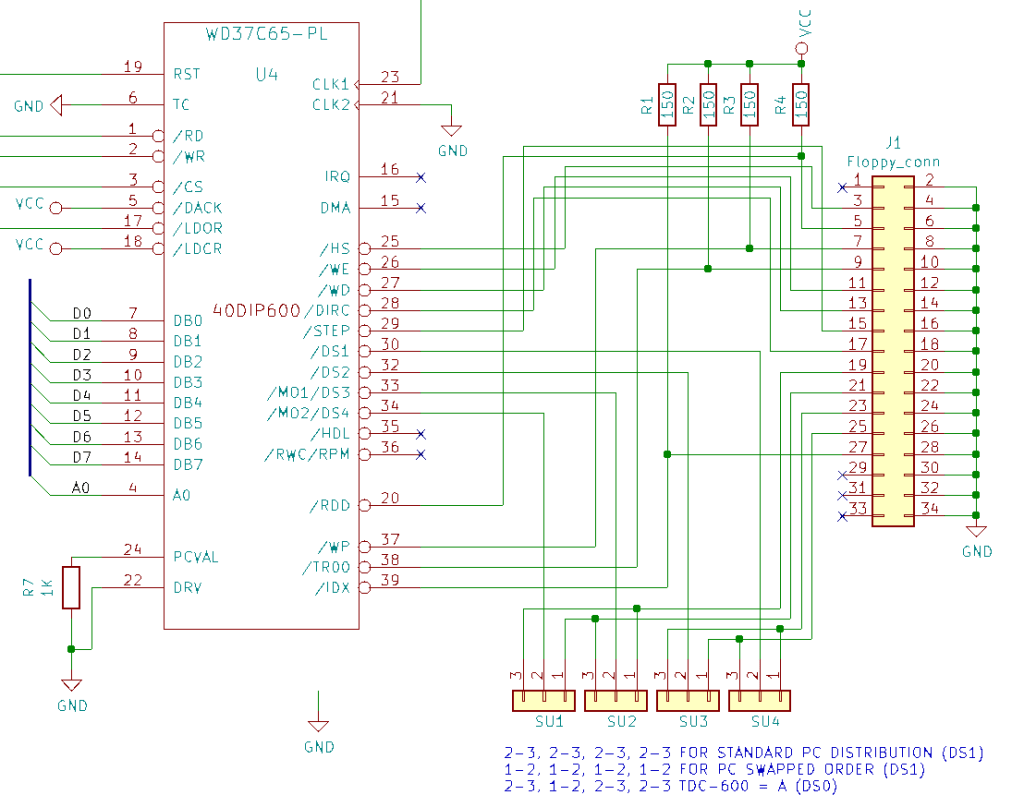 Y en cuanto a las salidas conectadas al WD37C65… hay que decir que son señales específicamente diseñadas para el propósito del chip, controlar la unidad de disco utilizando un conector para disco flexible de 34 pines, así que es básicamente una conexión directa entre varias salidas del chip y el pin del conector que cumpla ese cometido. Hay que recalcar que los conectores SU1 – SU4 sirven para cambiar el orden de ciertos pines y permitir así la conexión de diferentes tipos de disquetera, y por otro lado, las resistencias R1 a R4 son PULL-UP necesarias en ciertos tipos de conexiones para establecer el valor binario a «1» salvo que algún chip conectado fuerce esa salida a «0».