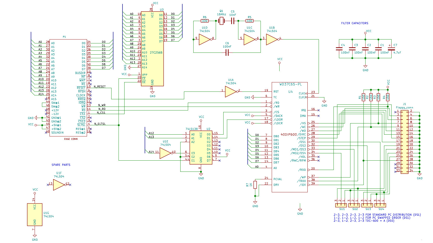 Y en cuanto a las salidas conectadas al WD37C65… hay que decir que son señales específicamente diseñadas para el propósito del chip, controlar la unidad de disco utilizando un conector para disco flexible de 34 pines, así que es básicamente una conexión directa entre varias salidas del chip y el pin del conector que cumpla ese cometido. Hay que recalcar que los conectores SU1 – SU4 sirven para cambiar el orden de ciertos pines y permitir así la conexión de diferentes tipos de disquetera, y por otro lado, las resistencias R1 a R4 son PULL-UP necesarias en ciertos tipos de conexiones para establecer el valor binario a «1» salvo que algún chip conectado fuerce esa salida a «0».