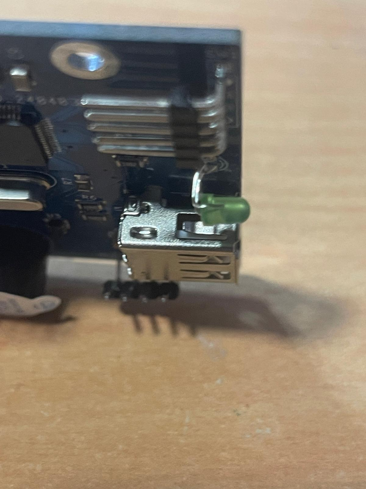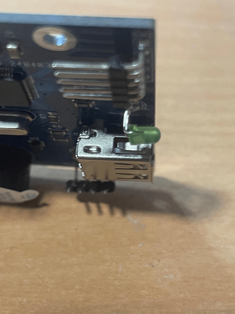 Otro componente que tiene polaridad es el led, la patilla corta es el negativo. Si miráis la placa donde va insertado el led tiene un pad redondo y otro cuadrado. La patilla corta (-) va insertada en el pad cuadrado. No la introduzcáis hasta el fondo, os tiene que quedar como en la siguiente fotografía.