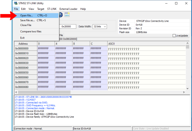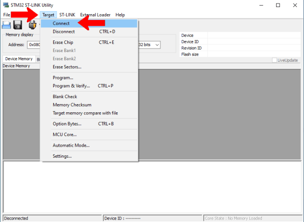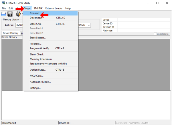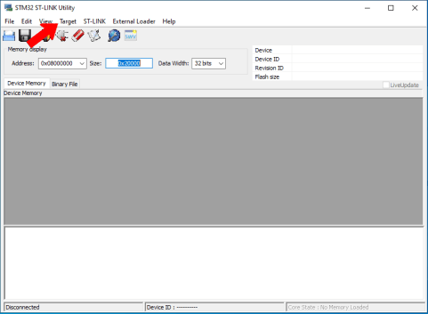 Desde el PC, abrid el programa ”STM32 ST-LINK Utility” y se nos mostrará la siguiente ventana. Desplegamos en el menú Target.