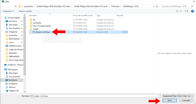 Buscaremos y seleccionaremos el archivo “FF_Gotek-v3.20.hex” y le damos al botón “Abrir”.
