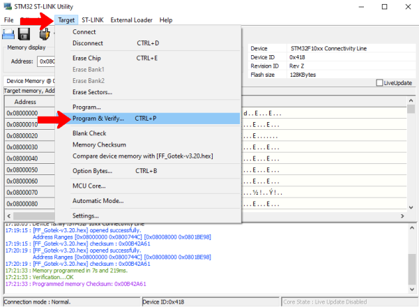 Ahora clickamos otra vez obre “Target” y luego sobre “Program & Verify…”.