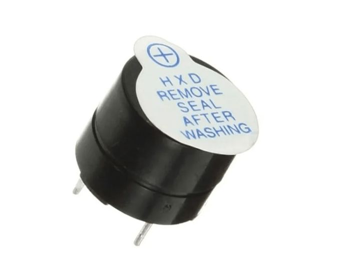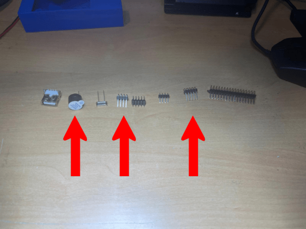 Atención con el zumbador, si miráis la pegatina tiene un signo “+” ese es el lado positivo y lo tenéis que hacer coincidir con el positivo en la serigrafía de la placa. Los siguientes son tiras de pines especiales. Si os fijáis las patillas son más largas,os explico cómo lo hice. Primero fijaros en estas fotos.