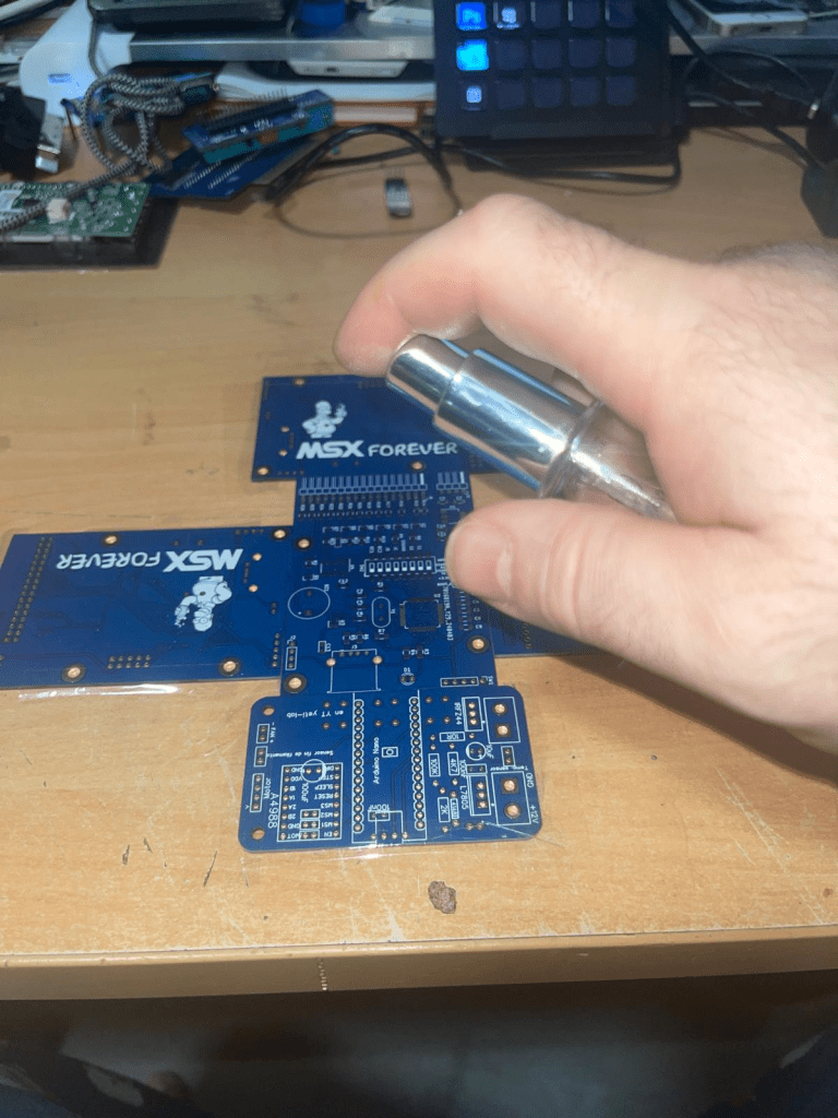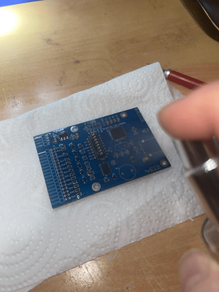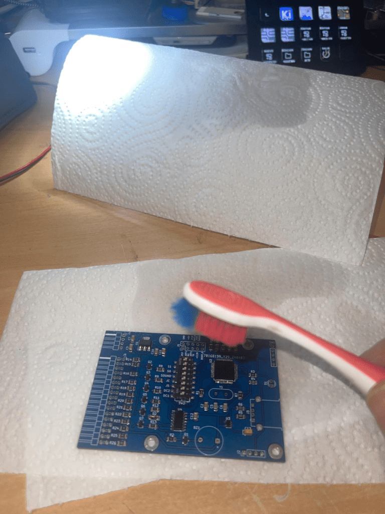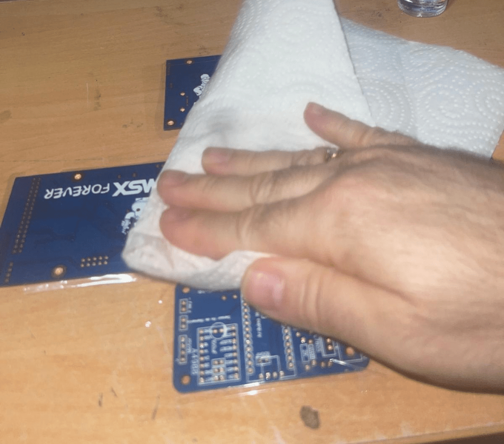 Utilizaremos para ello un cepillo de dientes, papel de cocina y alcohol isopropílico. Os explico cómo lo hago para dejarla bien pongo un trozo de papel encima de la mesa, para que no se ponga perdida, pongo la placa encima y echo alcohol como si no hubiera un mañana, le doy con el cepillo bien. Una vez acabado le vuelvo a echar alcohol igual que antes y le vuelvo a dar con el cepillo una vez más, seguidamente vuelvo a echar alcohol y luego le pongo un trozo de papel de cocina doblado por la mitad por encima y le vuelvo a dar con el cepillo por encima bien, no os preocupéis si se rompe la primera capa de papel pues aun está haciendo su función. Cuando ya creáis que es suficiente le quitáis el papel y con eso debería estar limpia, si por contra no ha quedado bien del todo, toca repetir el último paso.
