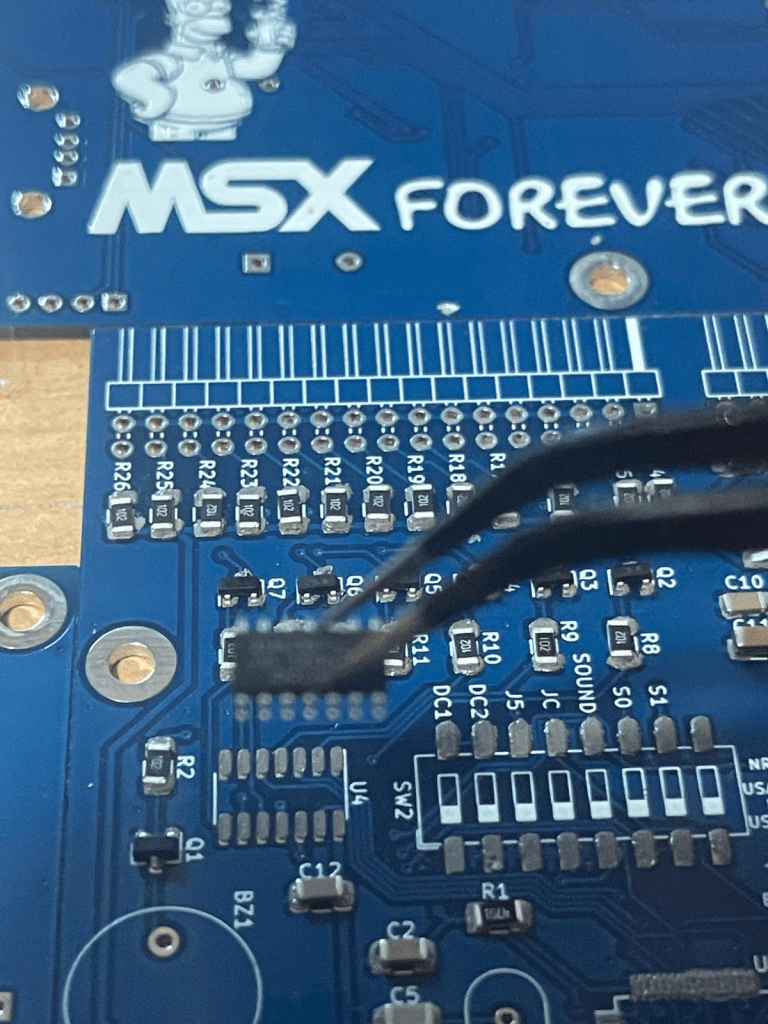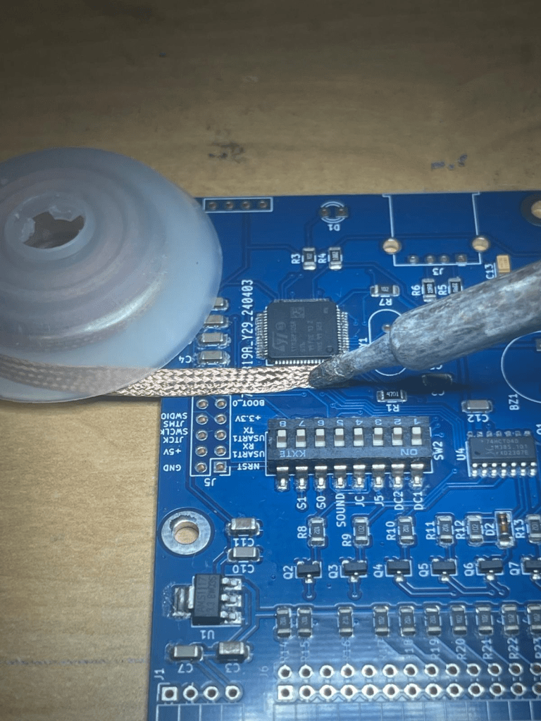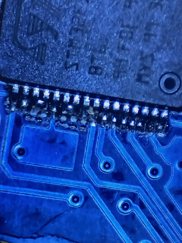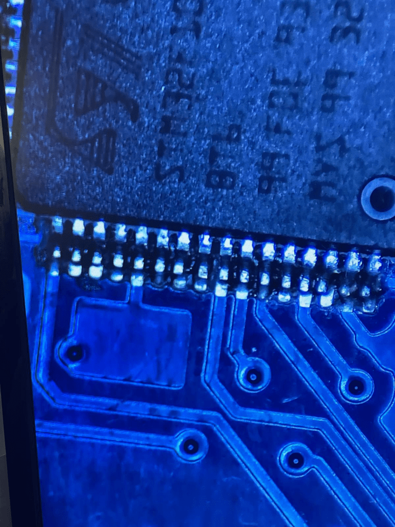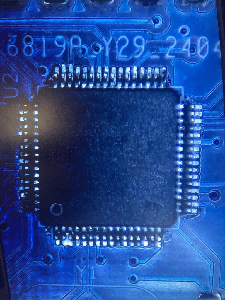 Bien, como veréis tiene “algún cruce” 🤣🤣🤣, pero como ya he dicho no hay problema. Aplicaremos un poco de flux a lo largo de las patillas, colocaremos la malla encima de las patillas, ponemos el soldador encima y lo movemos siempre de dentro hacia fuera y con mucho mimo, lo suficiente para no quitar todo el estaño, no tengáis prisa y si tenéis que hacer el procedimiento varias veces no pasa nada, es preferible. Este procedimiento lo aplico en los 4 lados del “U2”. El resultado final vale la pena.