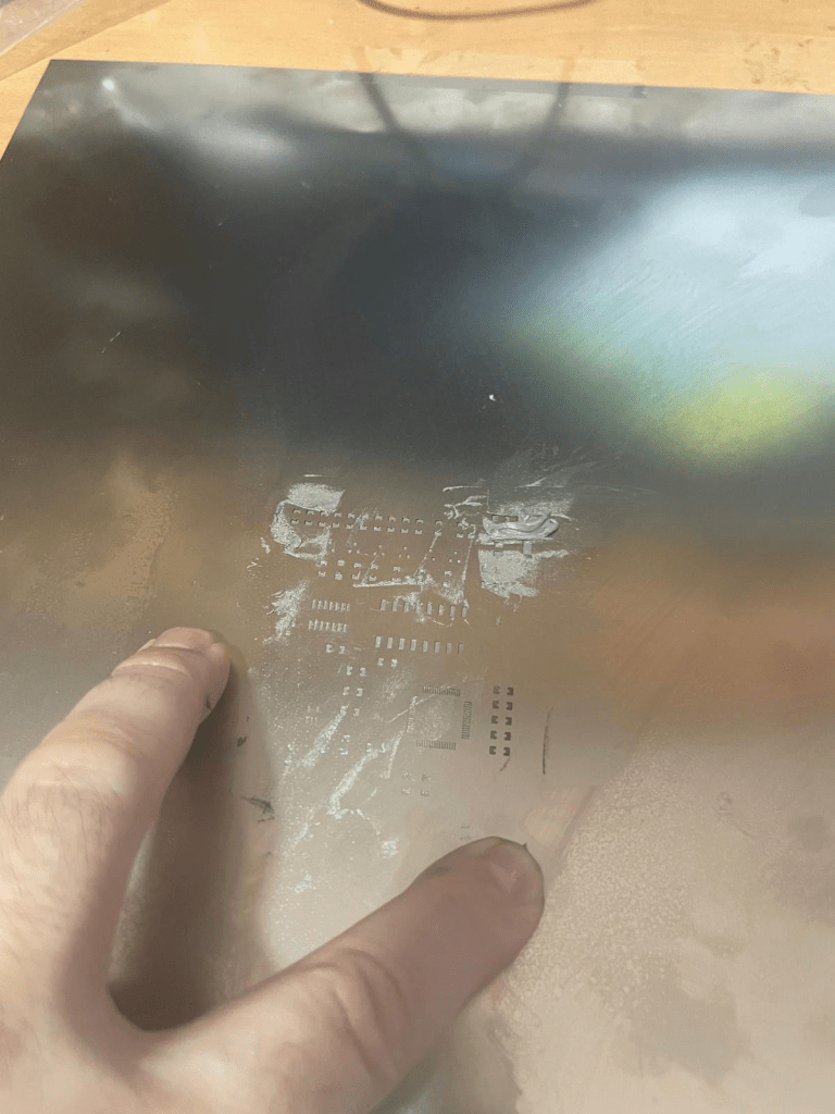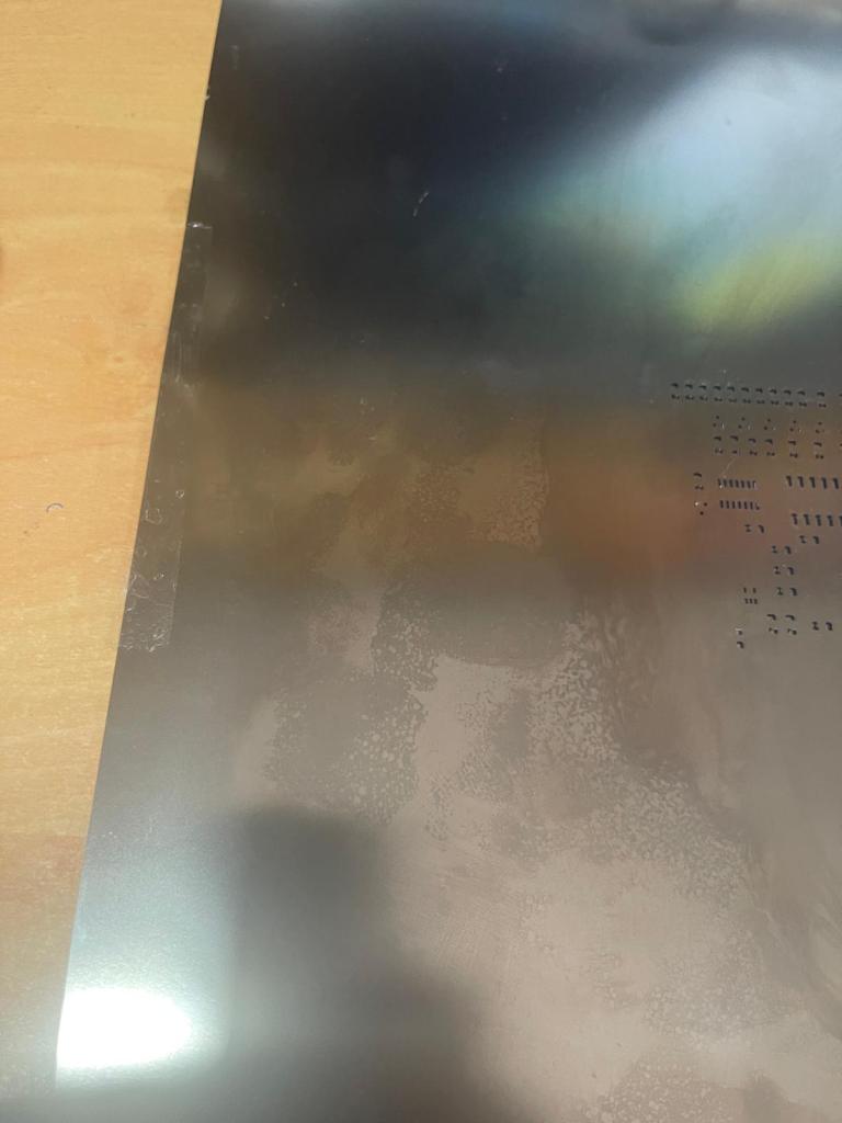 Es esencial limpiar antes de empezar, con alcohol isopropílico y papel de cocina, tanto la placa como la plantilla, ya que suelen venir con un poco de grasa. En las siguientes imágenes se ve el antes y el después de la limpieza de la placa y de la plantilla.