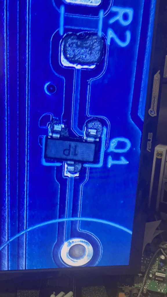 Muy bien, ahora vamos a revisar con el microscopio el lio que hay en “U2”. Como podéis observar hay algún cruce, pero no pasa nada son fáciles de quitar con el soldador, un poco de malla desoldadora y un poco de flux. Primero os paso una foto de cómo está el asunto en cuestión.