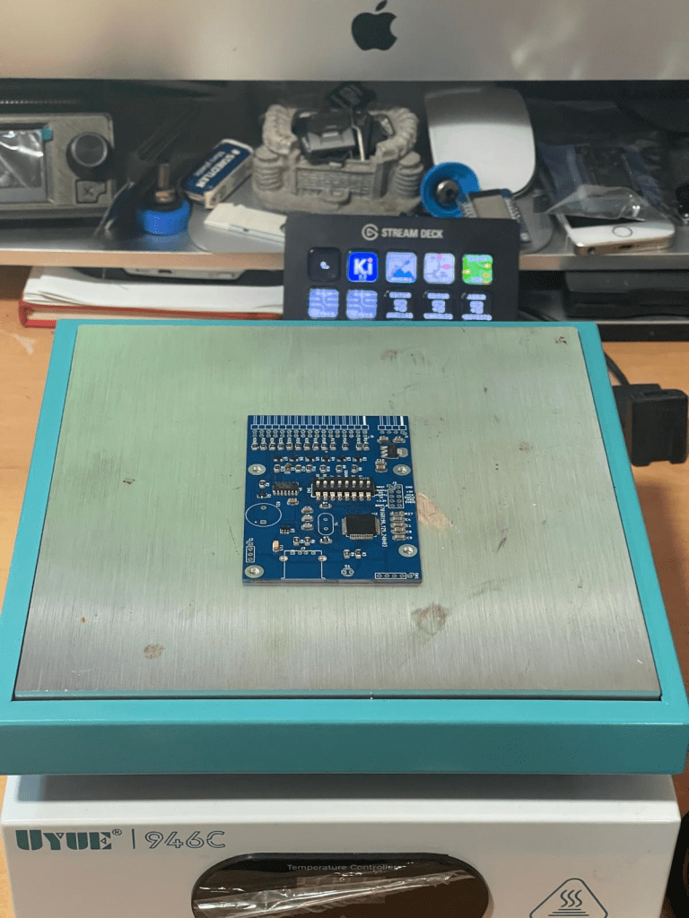 Bueno, ya hemos acabado de colocar los componentes SMD, vamos a “cocinar” la placa. Ya podemos quitar la cinta adhesiva y las placas de alrededor. Seguidamente pondremos la plancha de calentamiento encima de la mesa y con esta apagada pondremos el circuito (con sumo cuidado) encima de la placa calefactora. Una vez puesto todo en su sitio ya podemos encender la placa de calentamiento, yo la pongo a unos 200ºC y espero a que se funda todo. Os dejo fotos y un video donde se ve el proceso de estañado.