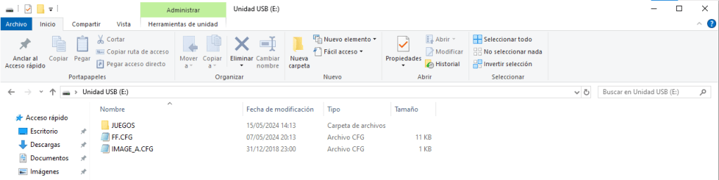 Bien ahora ya podemos apagar el MSX y retirar el pendrive, ya tienes actualizada la unidad Gotek. Ahora vamos a poner los archivos necesarios para que funcione correctamente. Inserta el Pendrive en el puerto USB del PC y te saldrá esto.