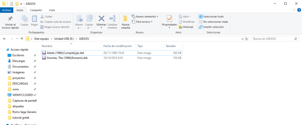 Elimina los archivos señalados por la «flechita» y añade una carpeta, por ejemplo una con el nombre «JUEGOS». En esta carpeta añadiremos un par de juegos para probar, en mi caso “The goonies.dsk” y “aleste.dsk”. No lo explico, hay tutoriales en internet al respecto, pero los archivos para que funcionen deben tener formato .DSK