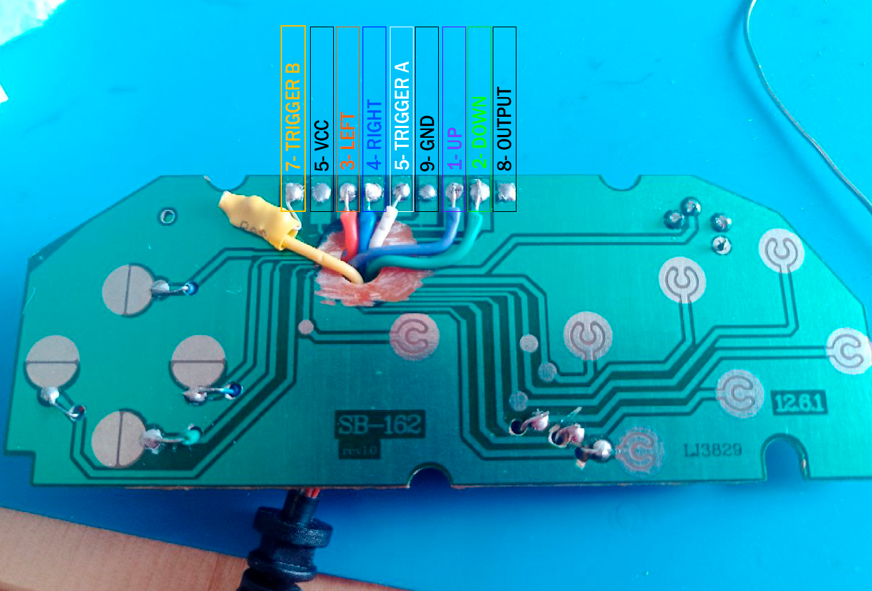 En el caso del [7- TRIGGER B], hemos aprovechado para montar la resistencia de 470 ohm en la parte frontal del mando y conectar directamente, para acabar protegiéndola con tubo termorretráctil. Los tres puntos marcados en negro en la foto (5- VCC, 9- GND y 8- OUTPUT), no necesitamos tocarlos.