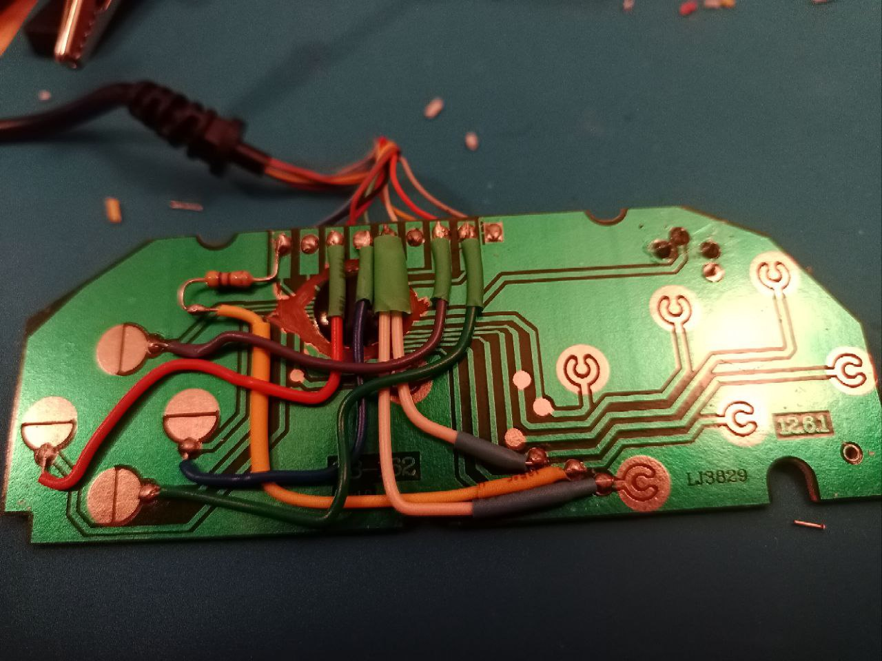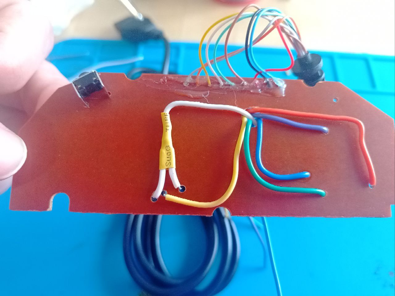Es perfectamente posible quitar todo el estaño de los puntos del 1 al 9 para pasar los cables a través de sus agujeros y soldar todo nuevamente, pero nos ha parecido un trabajo excesivo teniendo en cuenta que los cables del otro lado son muy pequeños y que además van unidos con cola a la placa, por lo que simplemente hemos optado por soldar nuestros cables encima. Para poder soldar los cables es posible que necesitemos sujetarlos a la vez que estaño y soldador, por lo que con cinta aislante podemos fijar los cables para trabajar y luego retirarla al terminar.