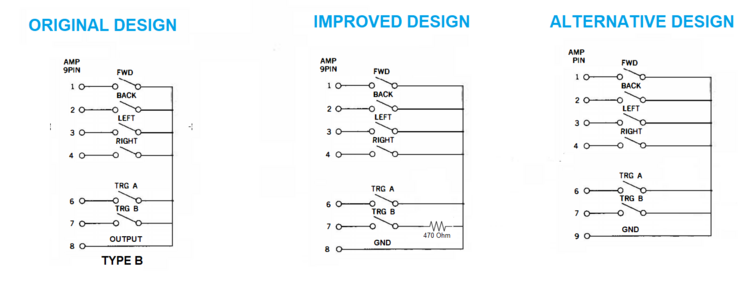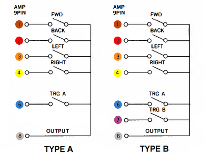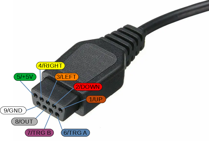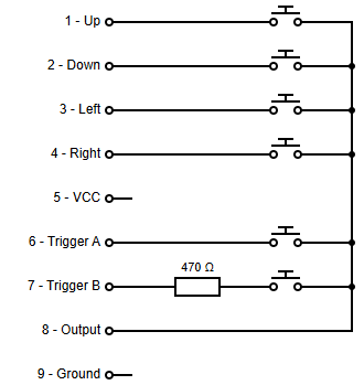 Por otro lado, tanto los 5v como Ground muchas veces no se utilizan en los cables de conexión tipo D9, el estándar que utilizan MSX, X68000, etc. Es por ello que estas conexiones se suelen reservar para chips, leds, etc., pero no son necesarias para el funcionamiento de un mando normal. Nosotros vamos a hacer un joystick tipo B, para tener dos botones y por tanto mayor compatibilidad.