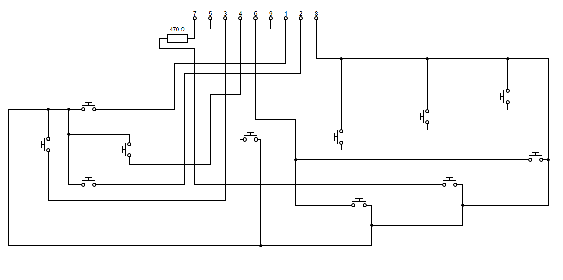 Trasladando estos conocimientos sobre cómo queremos que quede al mando de Mega Drive clónico que queremos modificar, nuestro pinout de cables debería quedar así finalmente. Nótese que 5 y 9 no hacen ningún contacto por no ser necesarios, y 8 es el output que hace contacto con todos los pines: