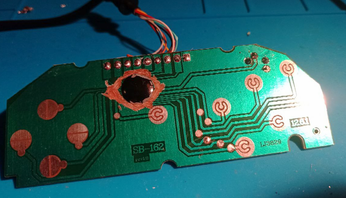 Al cortar las pistas nos estamos cargando todas las conexiones y, al ser una PCB de una sola capa, podemos perforarla tranquilamente para pasar cables por detrás. Más allá de la estética, este mando tiene poco hueco entre botones, un problema que hemos notado haciéndolo por primera vez. Así que para no afectar a su funcionamiento, recomendamos hacerle agujeros y hacer todo el montaje por atrás: