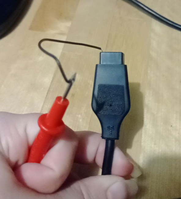 En estos casos, lo que necesitamos es simplemente tocar con el multímetro el interior del pin para verificar las conexiones e ir anotándolas. Dado que no llegará por su pequeño diámetro, podemos pelar un cable por dos lados, enrollarlo alrededor de una de las puntas del multímetro, y con la otra punta del cable tocar el interior del pin que queremos verificar, como se ve en la siguiente imagen. Mientras tanto, con la otra punta del multímetro tocaríamos los puntos para ver si hay conexión: