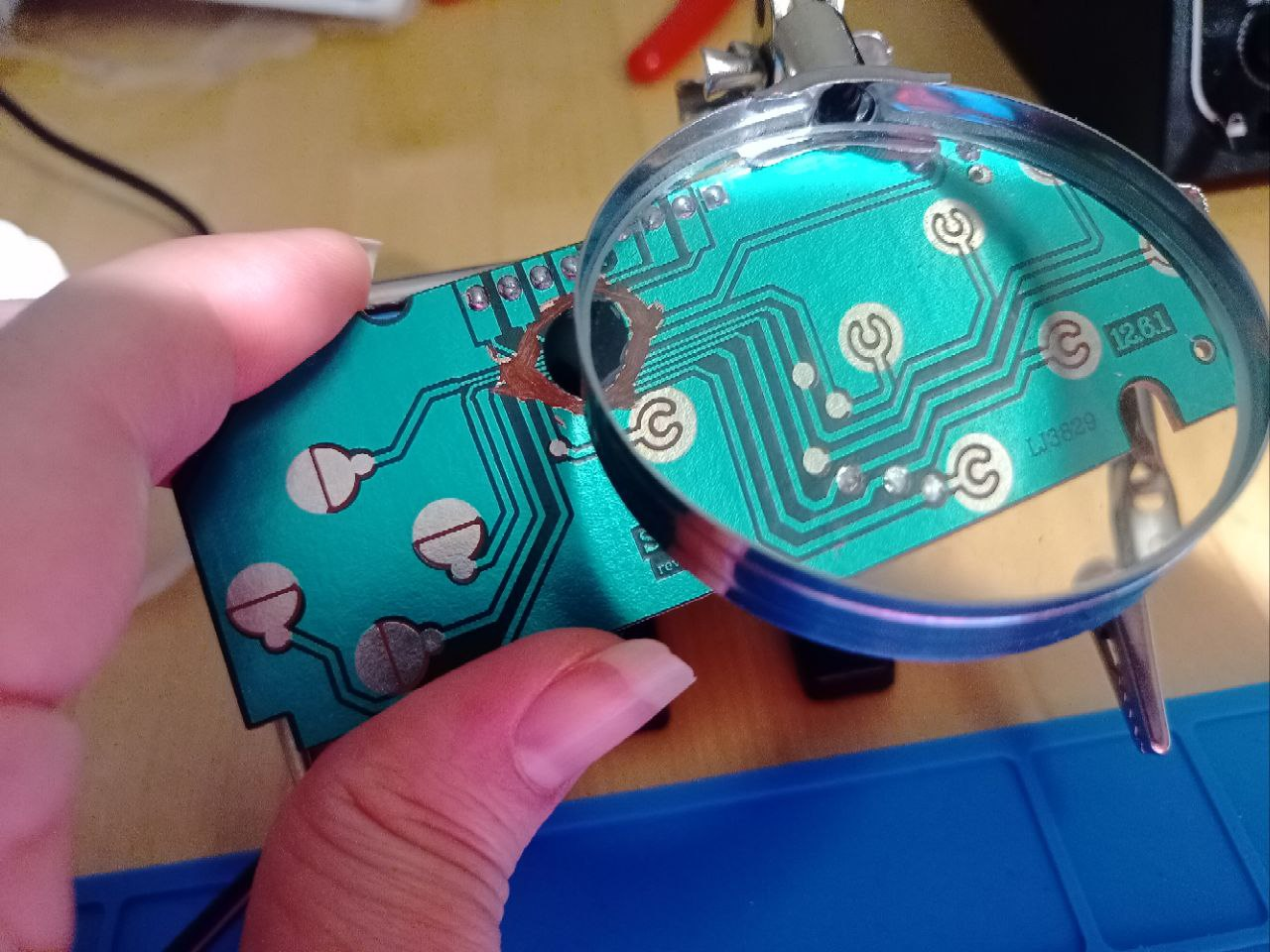 3. Probablemente caerá demasiada cantidad, por lo que podemos calentar nuevamente el estaño ya aplicado y dar un golpecito con la PCB contra la mesa para quitar el exceso, dejándonos un resultado final similar a este que podemos ver en los tres botones de abajo a través de la lupa: